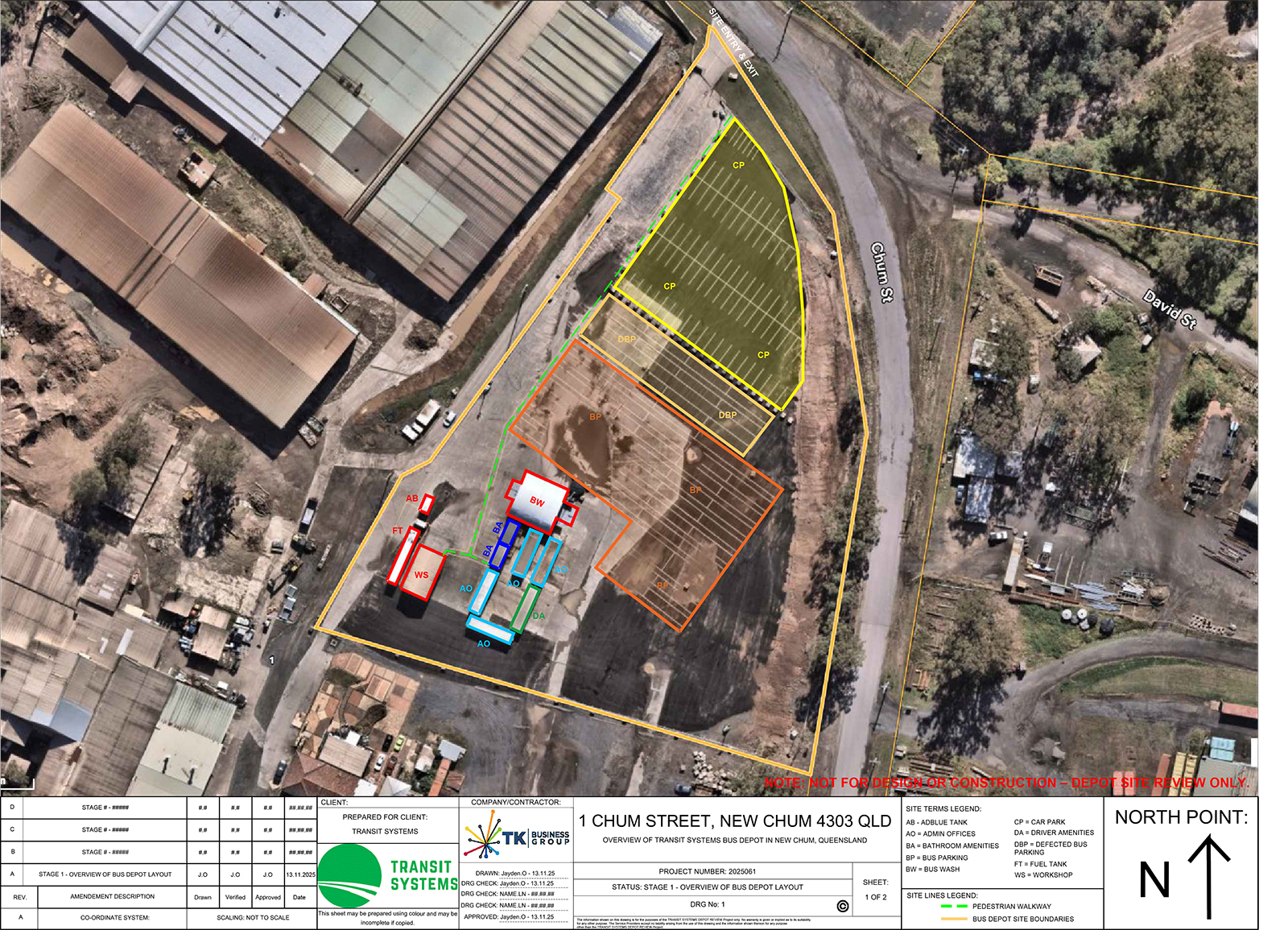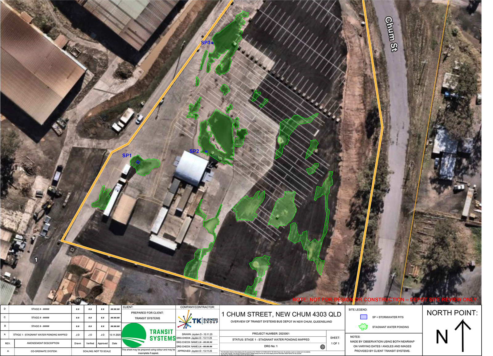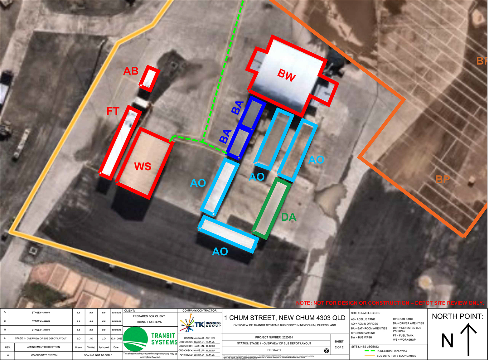 TK Business Group was engaged by Transit Systems to establish and document the baseline condition of ground surfaces and site infrastructure at the Temporary New Chum Bus Depot. The assessment was undertaken to support Transit Systems’ operational use of the site while the permanent depot is under construction.